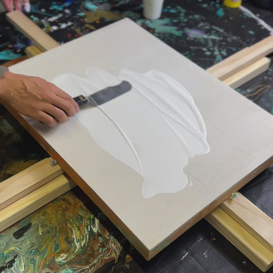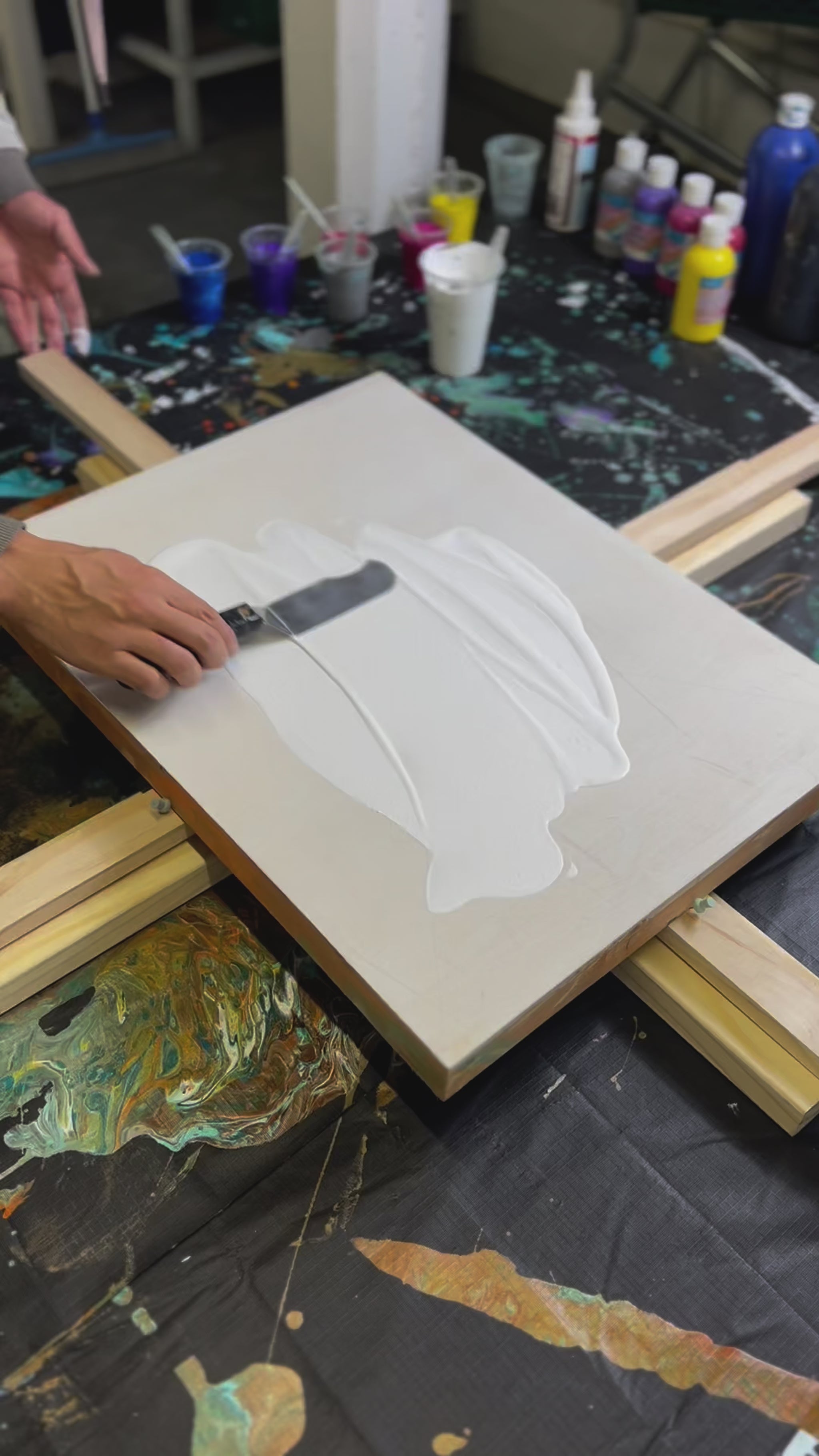 Medium: Acrylic paint pouring and stencilling using acrylic spray paint and brush work on wooden board.