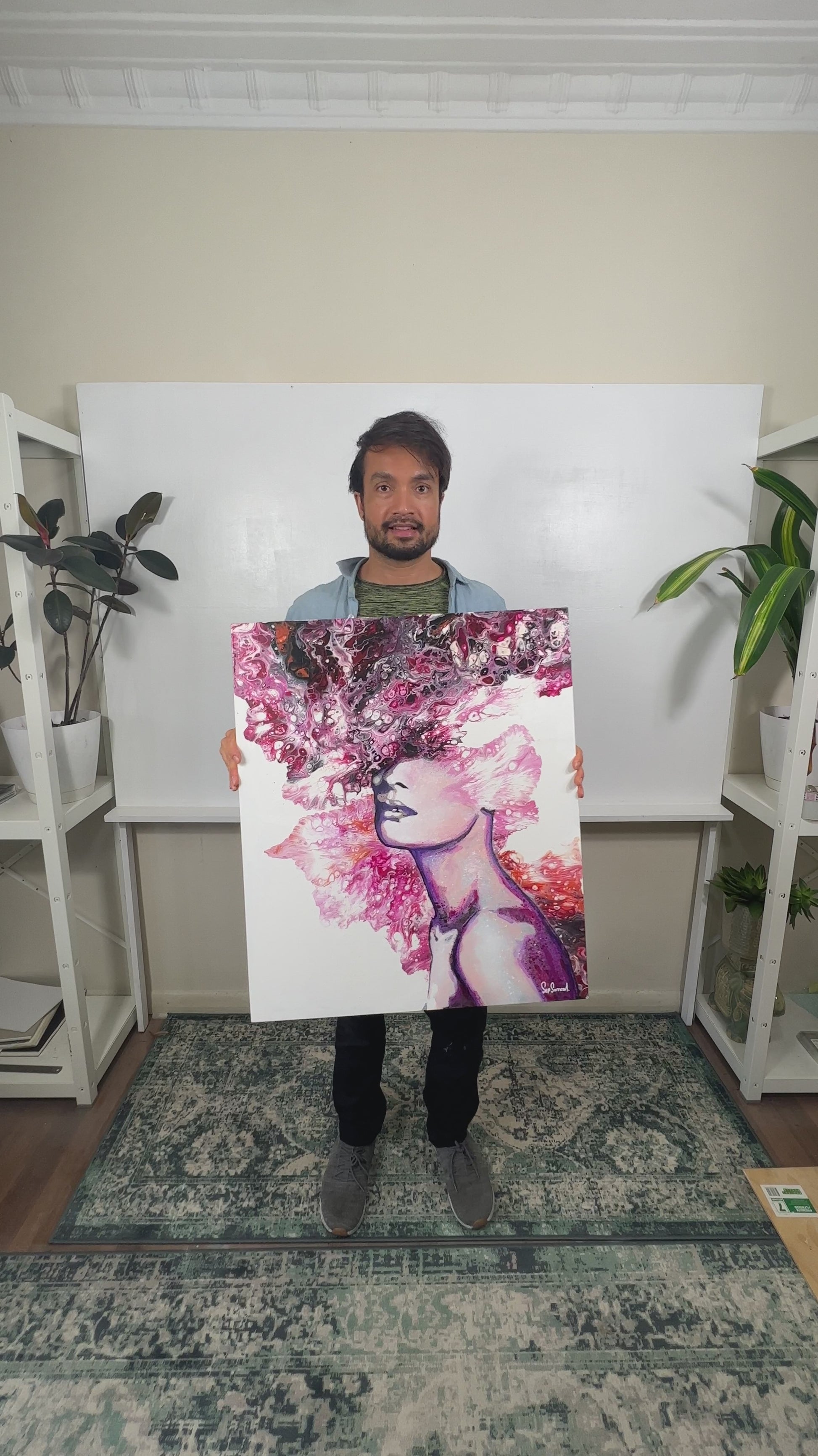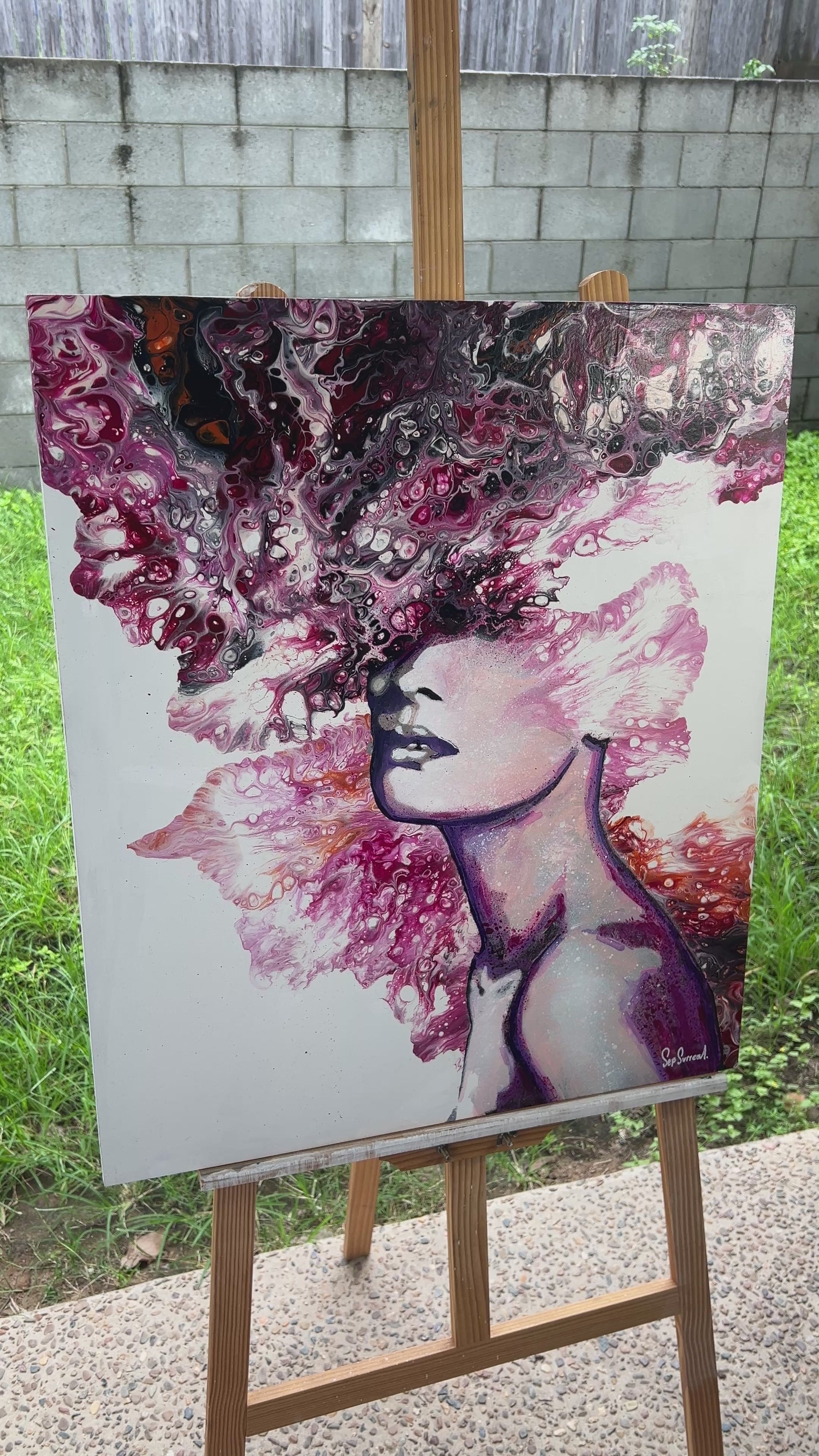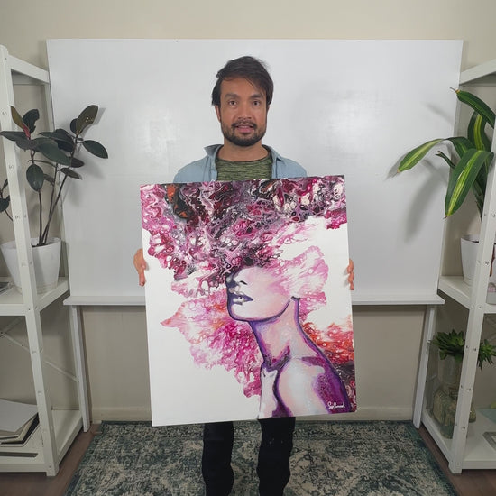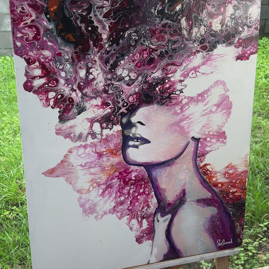 Ethereal Mind captures the interplay between chaos and clarity through a striking fusion of paint pouring and refined brush detailing. A serene female figure emerges from a dreamlike swirl of marbled textures and vivid hues, her face poised in quiet contemplation while her mind dissolves into an abstract explosion of colour. Viscous rivers of magenta, crimson, and ink-black flow outward, evoking neural pathways or cosmic clouds, blurring the boundary between thought and universe. Sep Surreal’s unique blend of fluid abstraction and figurative portraiture invites viewers to peer into the unspoken depths of human consciousness, a visual meditation on imagination, inner worlds, and the transcendence of thought.