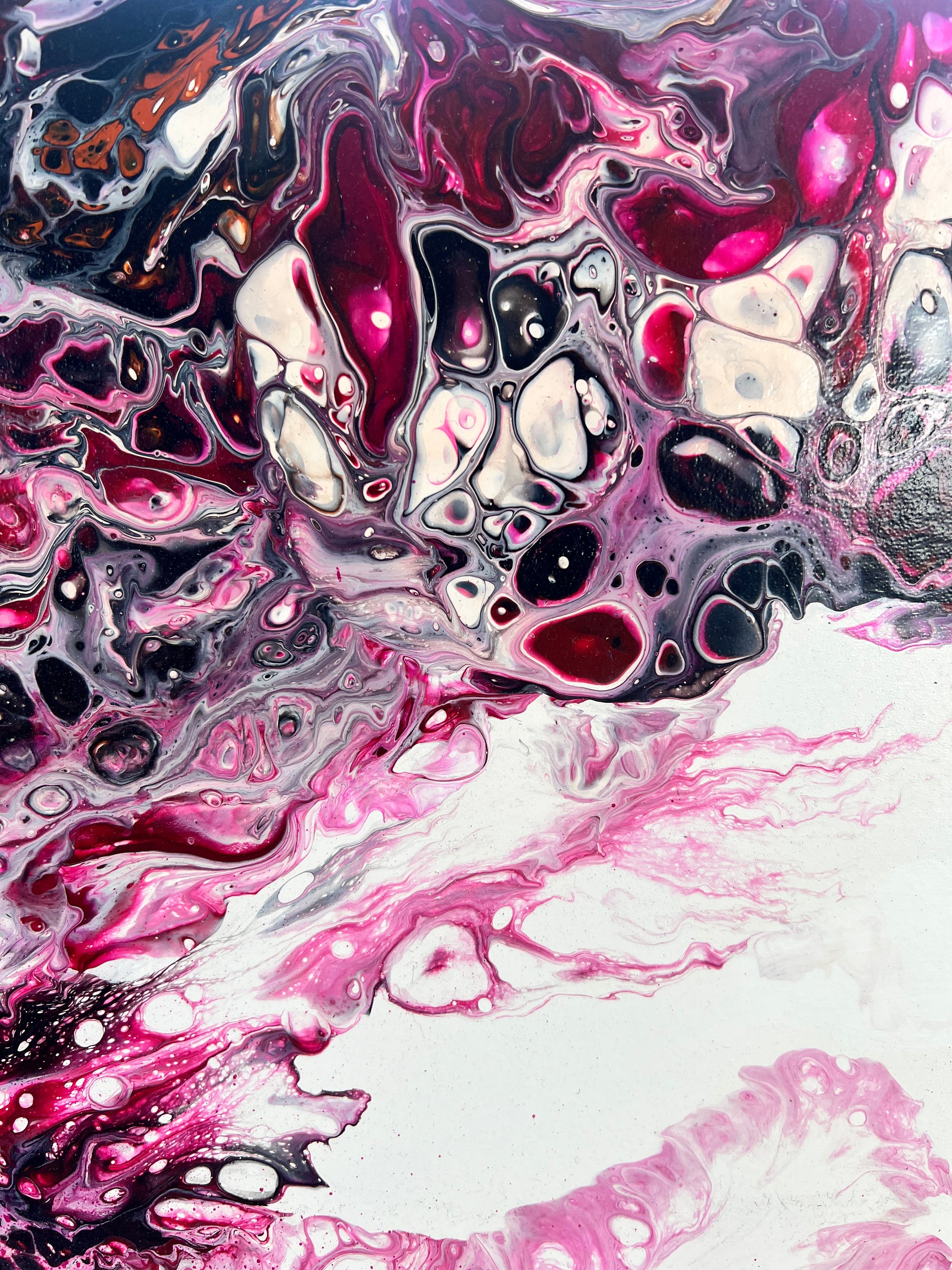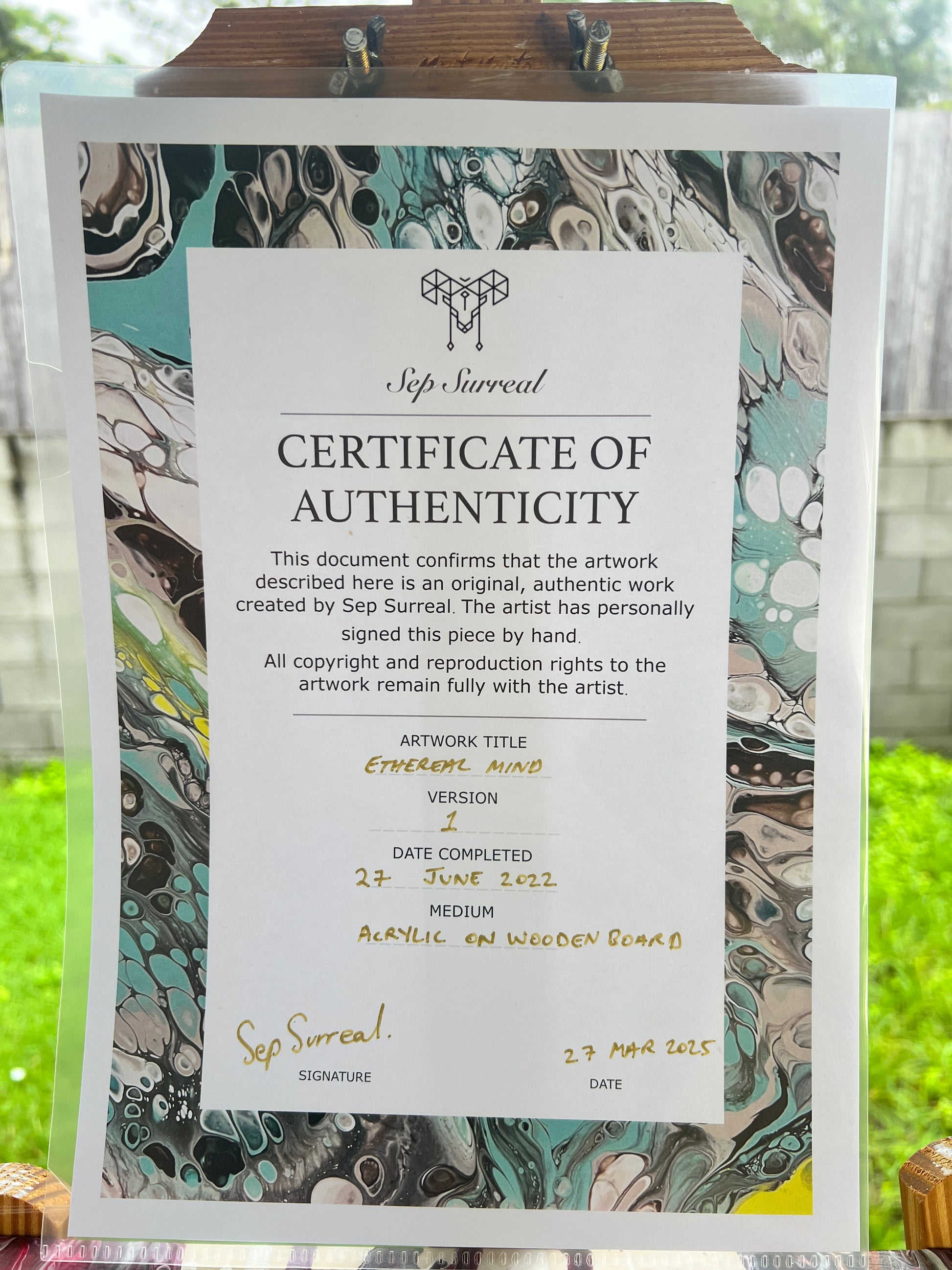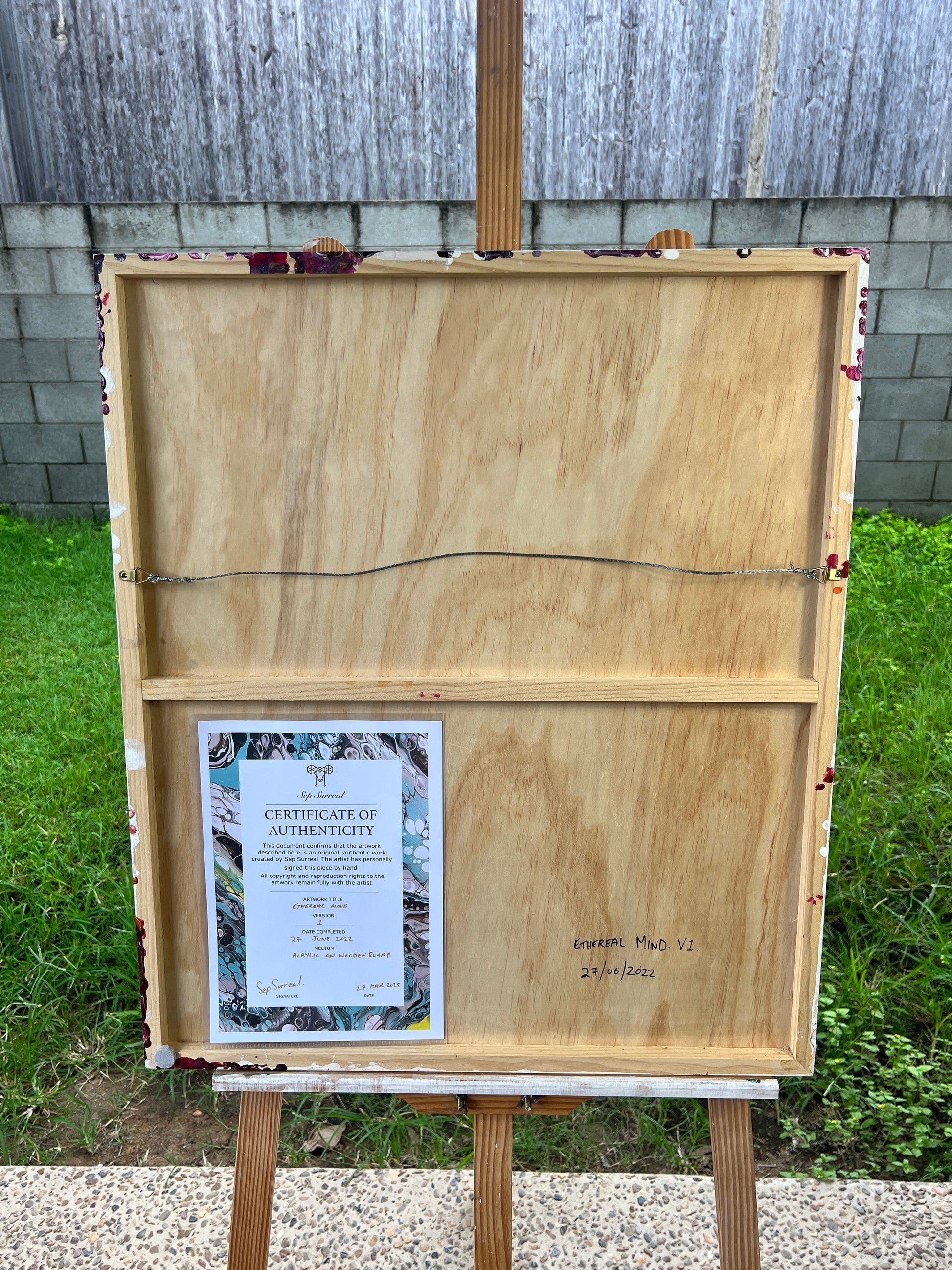 Ethereal Mind captures the interplay between chaos and clarity through a striking fusion of paint pouring and refined brush detailing. A serene female figure emerges from a dreamlike swirl of marbled textures and vivid hues, her face poised in quiet contemplation while her mind dissolves into an abstract explosion of colour. Viscous rivers of magenta, crimson, and ink-black flow outward, evoking neural pathways or cosmic clouds, blurring the boundary between thought and universe. Sep Surreal’s unique blend of fluid abstraction and figurative portraiture invites viewers to peer into the unspoken depths of human consciousness, a visual meditation on imagination, inner worlds, and the transcendence of thought.