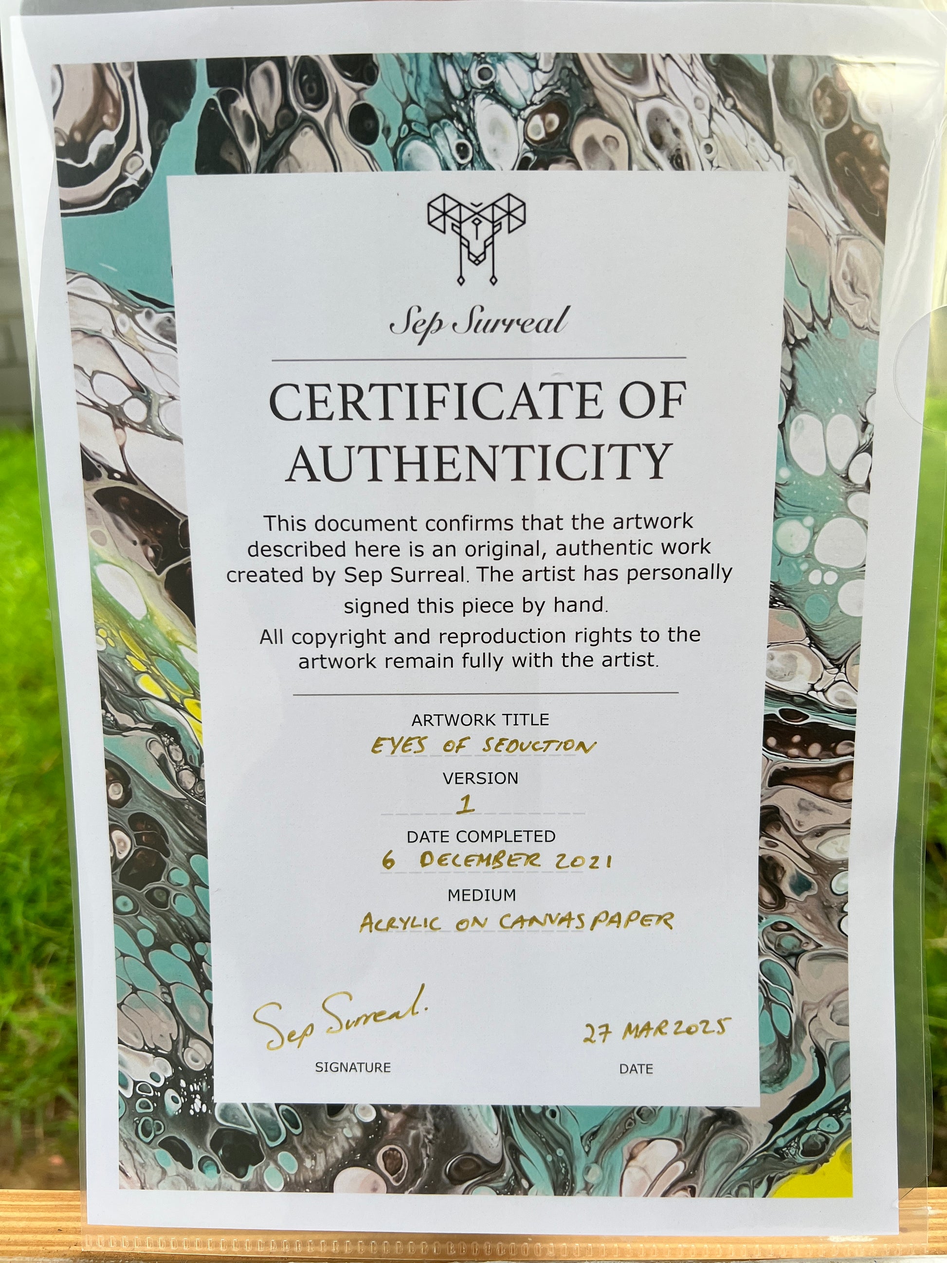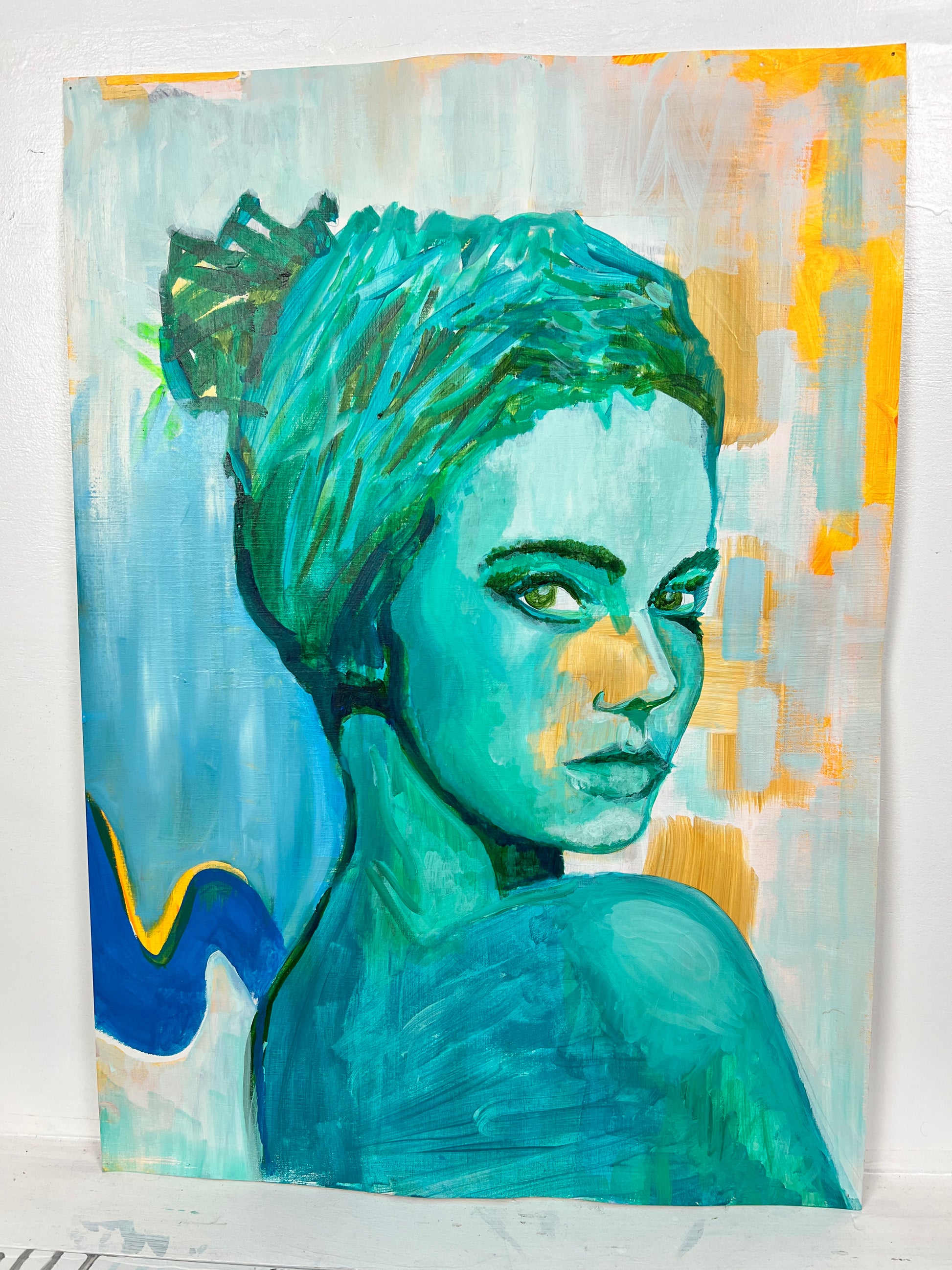 A captivating portrait steeped in emotion and allure, Eyes of Seduction draws you in with its intense gaze and bold colour palette. Sep Surreal fuses expressive brushwork with an almost sculptural use of turquoise and teal tones, giving the subject an ethereal presence. Contrasting blocks of golden orange pulse around her, creating a dynamic tension between calm and heat. The woman's glance, piercing, unapologetic and enigmatic, becomes the focal point, embodying both power and vulnerability. This piece whispers with silent intensity, leaving viewers entranced and questioning what story lies behind those eyes.