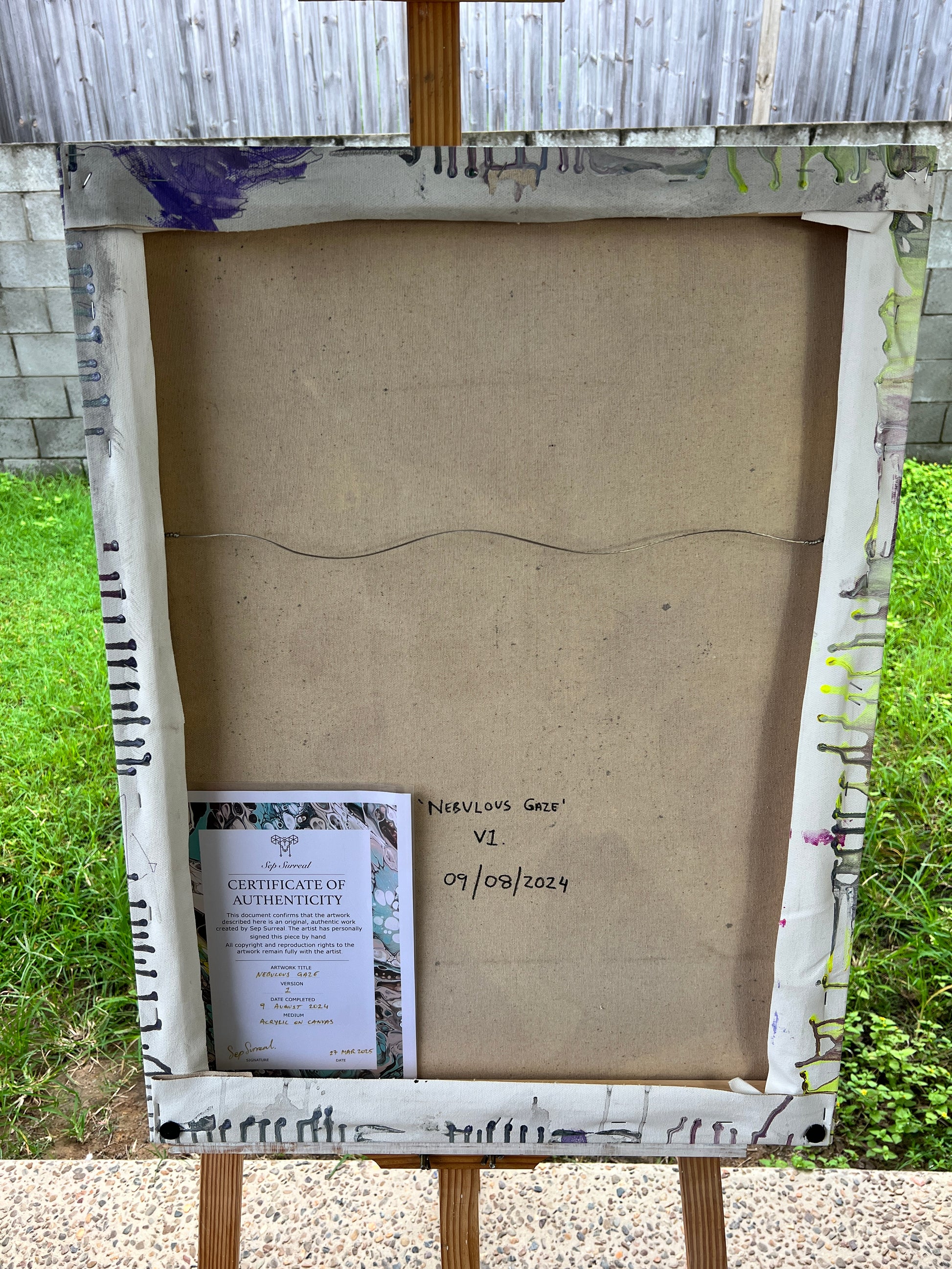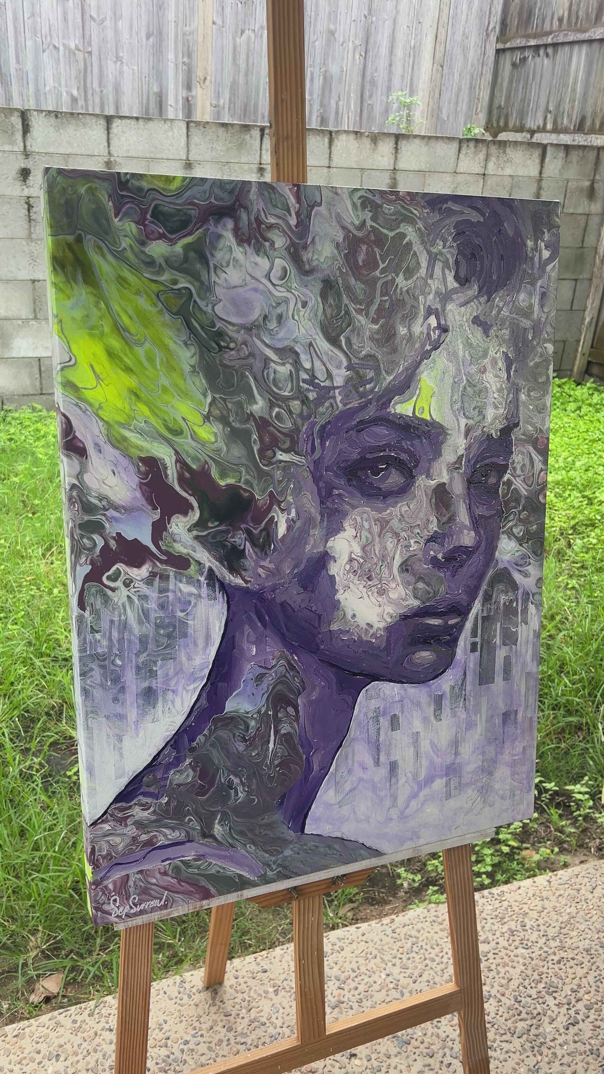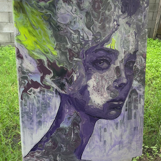 Nebulous Gaze is an original artwork by Sep Surreal, created through an intricate blend of fluid acrylic paint pouring and detailed brush painting layered on top. This piece captures a dreamlike portrait emerging from a swirling cosmos of colour and texture, where deep violets, marbled greys, and flashes of neon yellow collide in hypnotic motion.